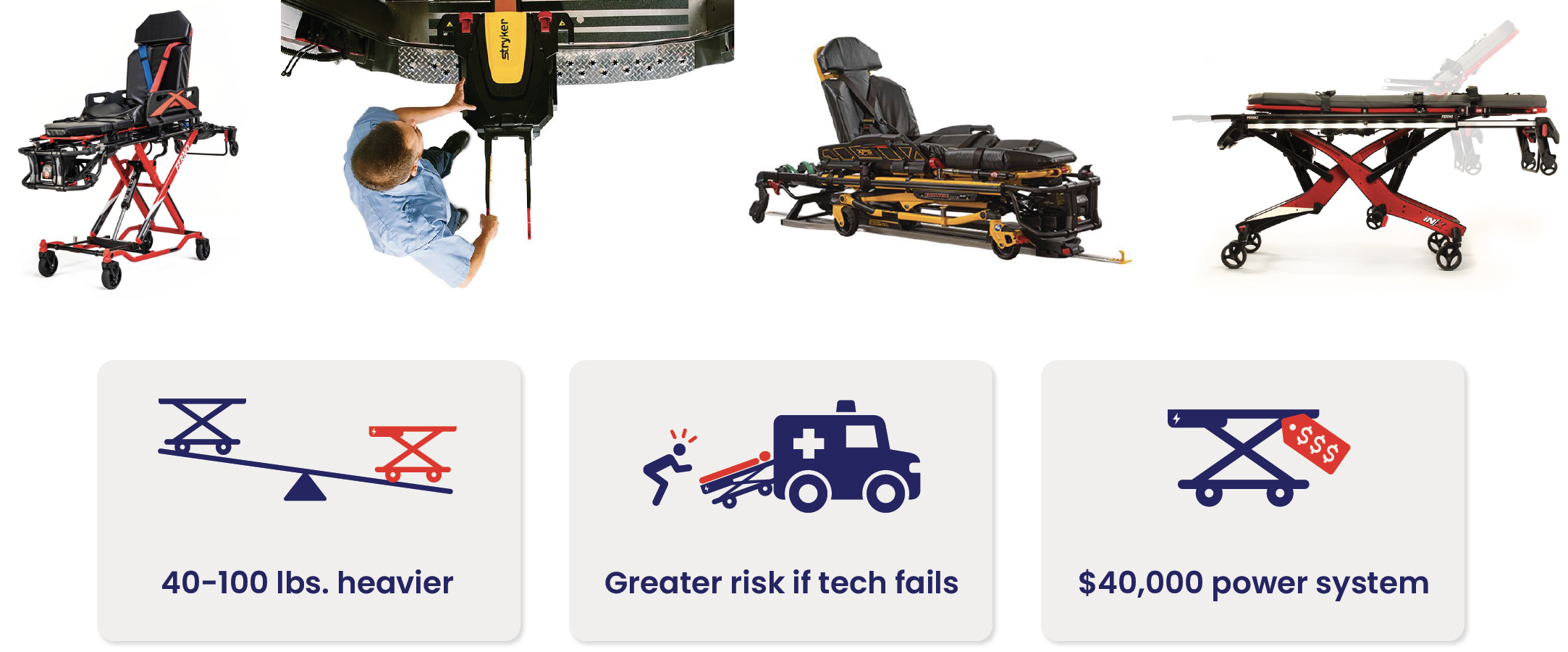 The current antidote to the lifting risks faced by EMTs come in a variety of powered stretcher and fastening systems. However, some systems still require EMTs to bear significant weight. Furthermore, automatic stretchers are even heavier than manual stretchers, introducing an even bigger risk should the technology fail. Finally, a fully powered stretcher system costs upwards of $40,000, well beyond reach for many EMS departments.